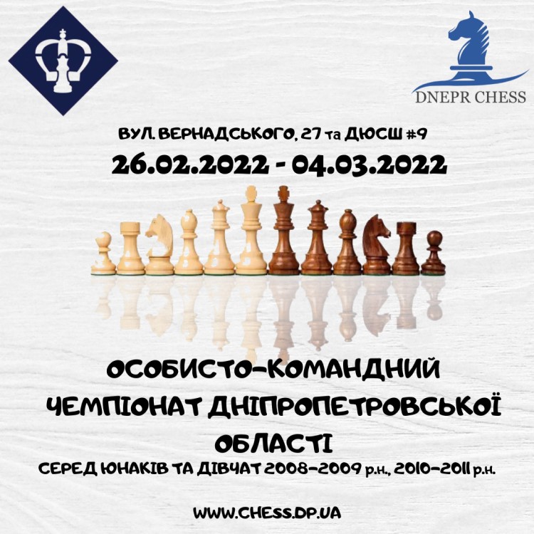 З 26 лютого по 04 березня 2022 року пройде Особисто-командний чемпіонат Дніпропетровської області серед юнаків та дівчат 2008-2009 р.н. (до 14 років), 2010-2011 р.н. (до 12 років).